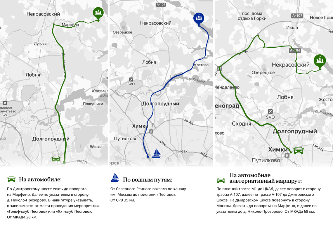 Наш яхт клуб расположен в 35 км от Москвы на севере Московской области на берегу живописного Пестовского Водохранилища. Клуб не публичный и используется только как закрытый яхт клуб и ивент площадка для MICE&Weddings. Из Москвы к нам можно добраться либо по Дмитровскому шоссе за 1 час. Либо по водным путям от Северного речного вокзала, от 1,5 часов на моторной яхте и до 2,5 часов на теплоходе-банкетоходе.