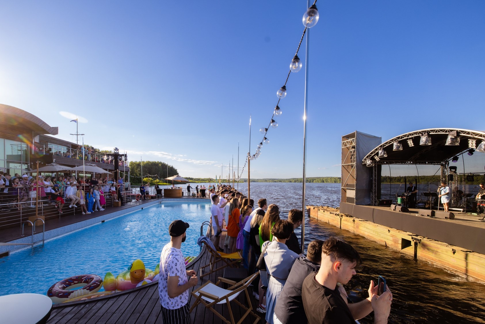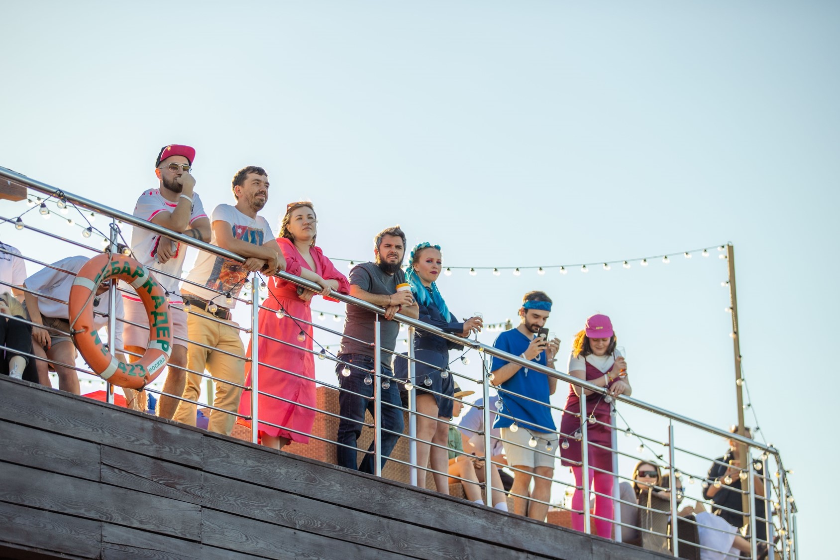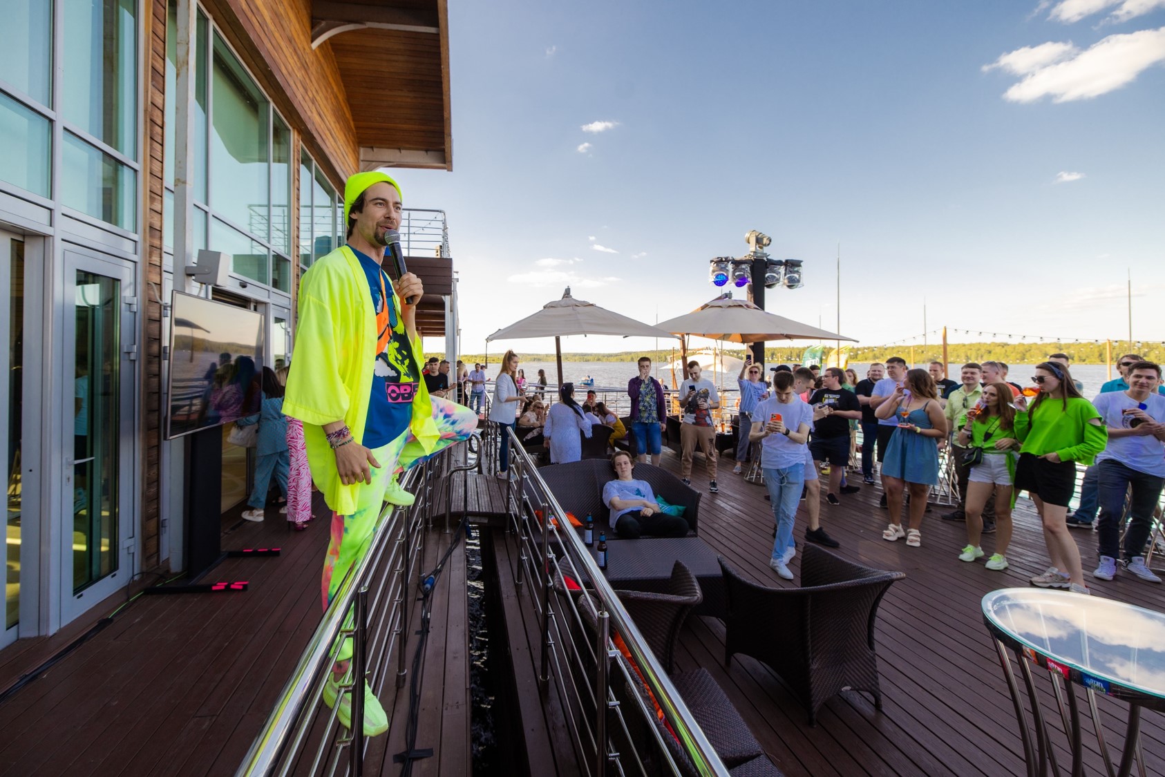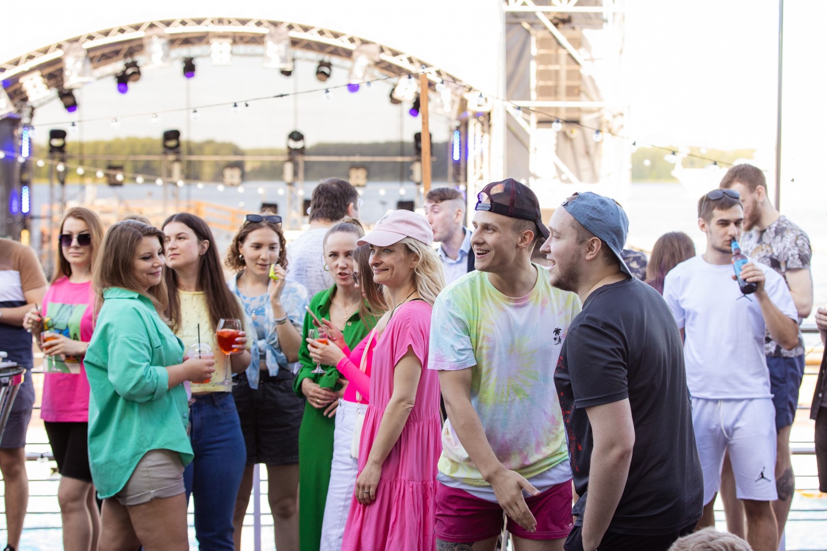 300 гостей, сотрудников банка <Модуль>. На время мероприятия дебаркадер превратился в единое крутое молодёжное ивент пространство с танцевальным клубом, кальянной, кинозалом, бассейном, караоке, с плавучей сценой на понтонах для хэдлайнера мероприятия. (С) <Пели всю ночь, гуляли всю ночь до утра>