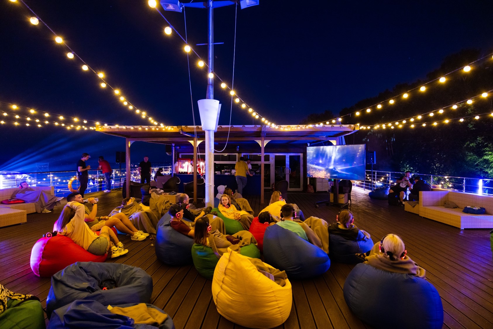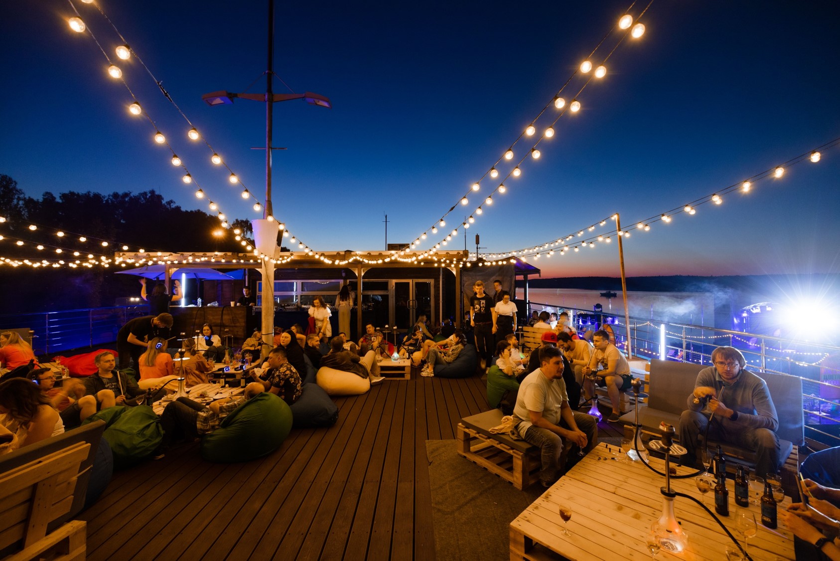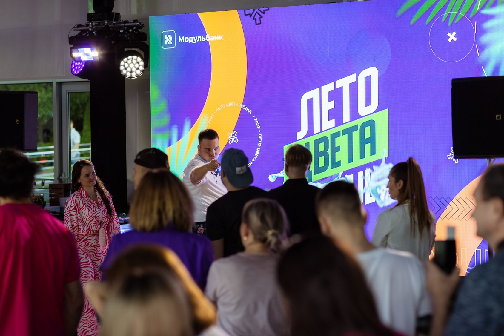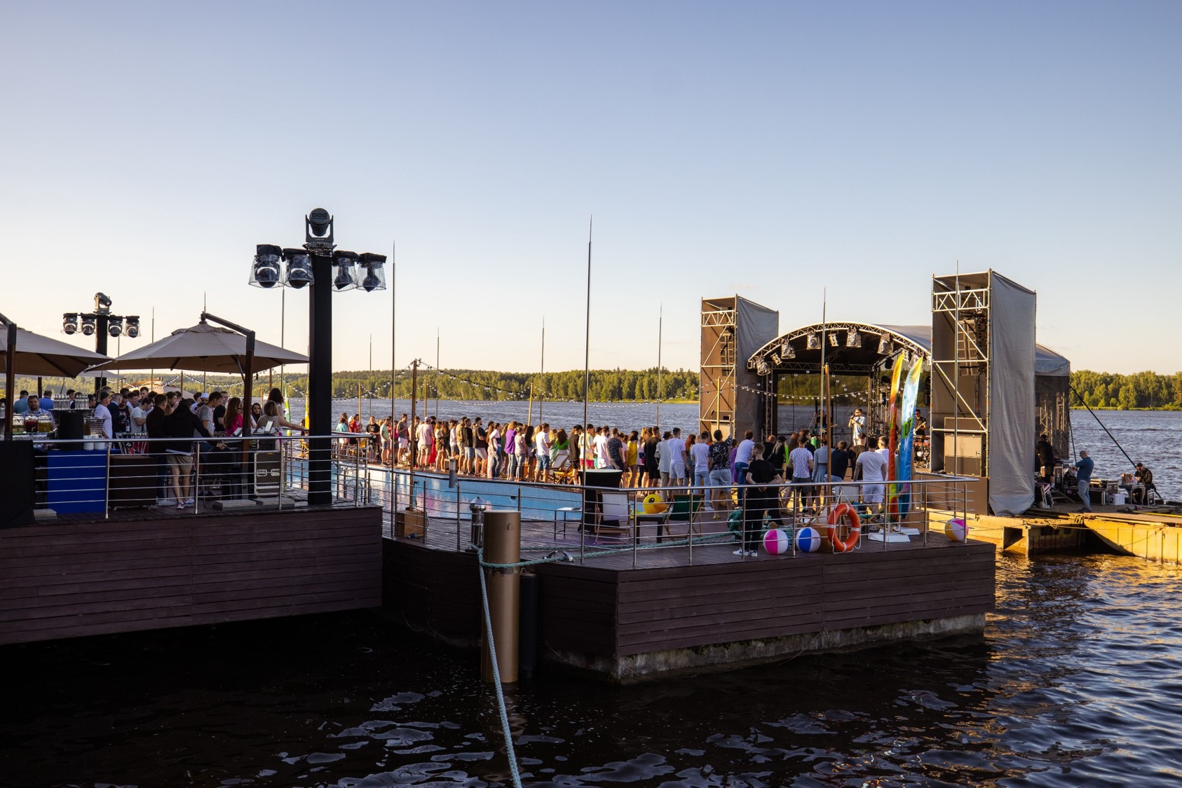 300 гостей, сотрудников банка <Модуль>. На время мероприятия дебаркадер превратился в единое крутое молодёжное ивент пространство с танцевальным клубом, кальянной, кинозалом, бассейном, караоке, с плавучей сценой на понтонах для хэдлайнера мероприятия. (С) <Пели всю ночь, гуляли всю ночь до утра>