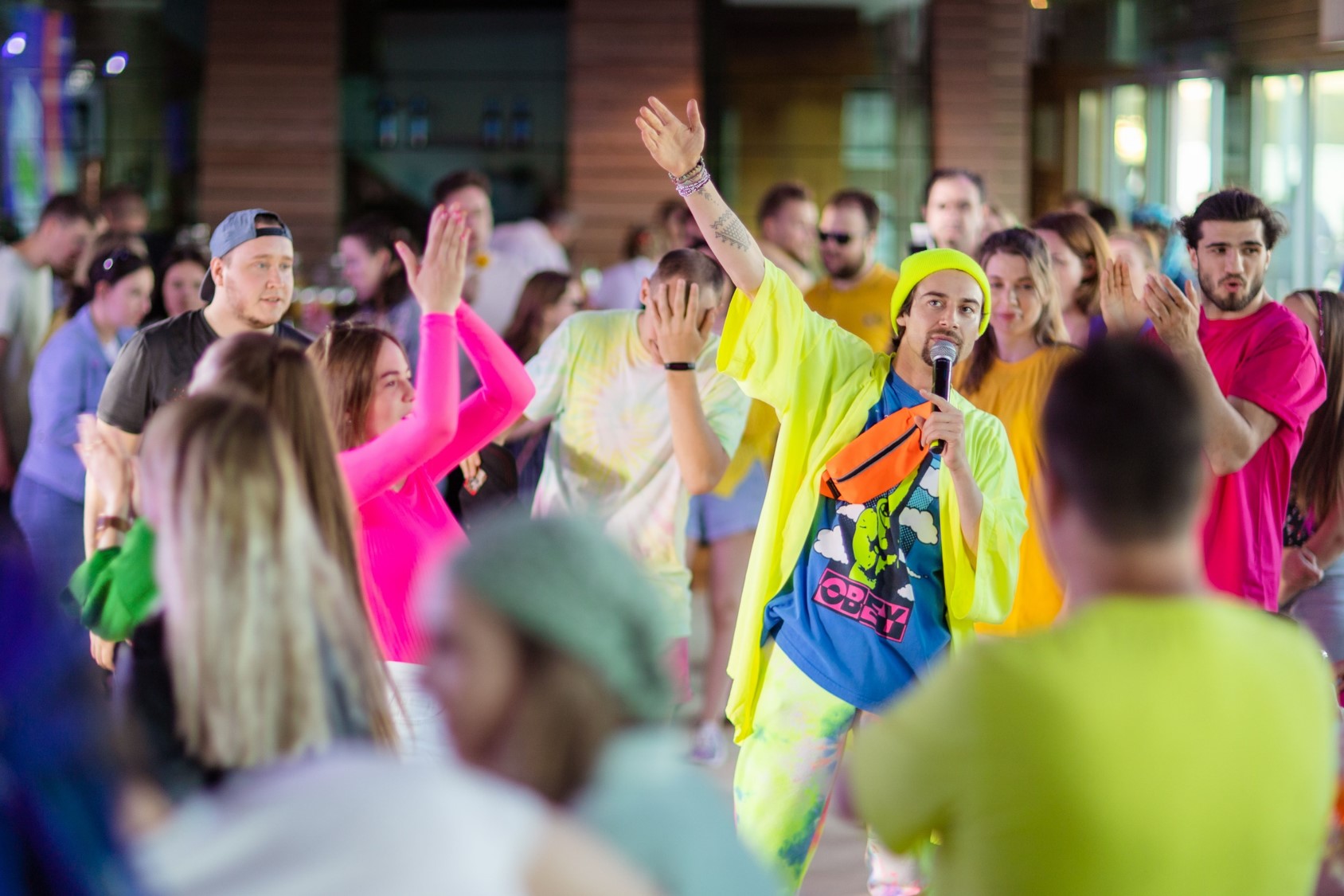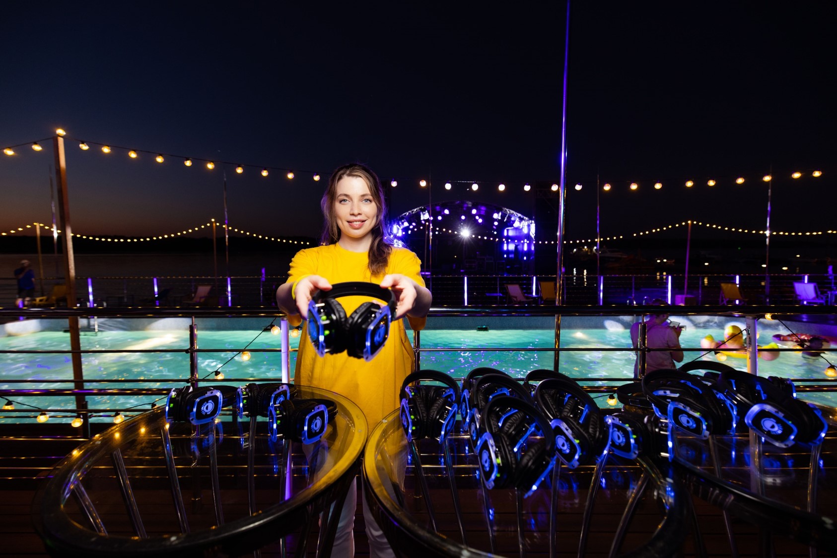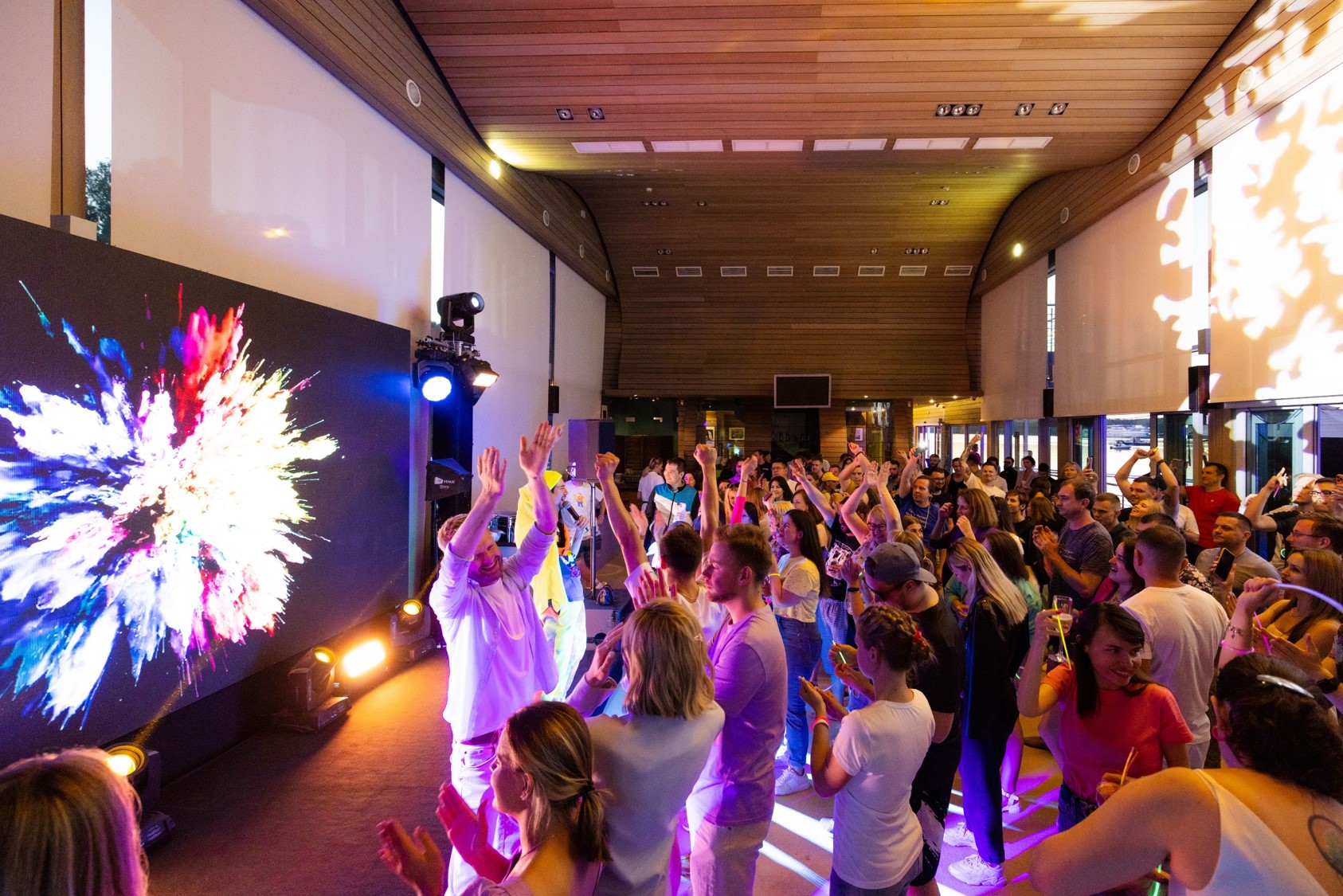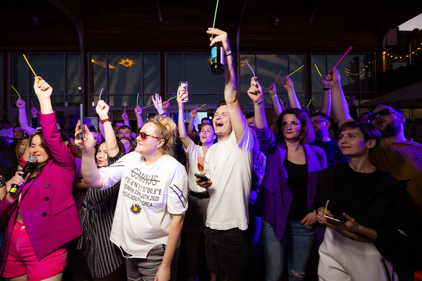 300 гостей, сотрудников банка <Модуль>. На время мероприятия дебаркадер превратился в единое крутое молодёжное ивент пространство с танцевальным клубом, кальянной, кинозалом, бассейном, караоке, с плавучей сценой на понтонах для хэдлайнера мероприятия. (С) <Пели всю ночь, гуляли всю ночь до утра>