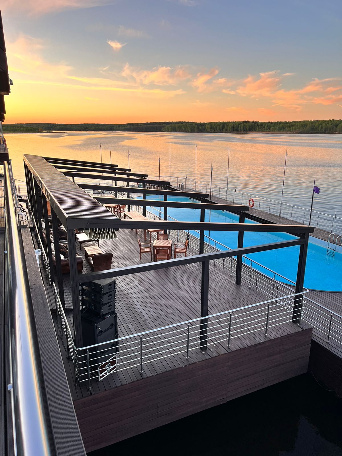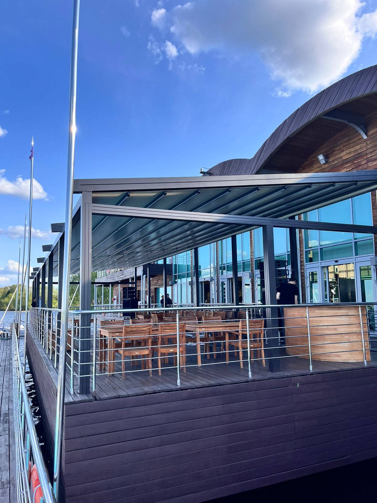 В новый сезон вступаем обновлёнными. Над летней верандой дебаркадера яхт-клуба сооружена и введена в эксплуатацию маркиза с автоматически сдвигаемой и раздвигаемой крышей с подсветкой. Теперь не страшен дождь!